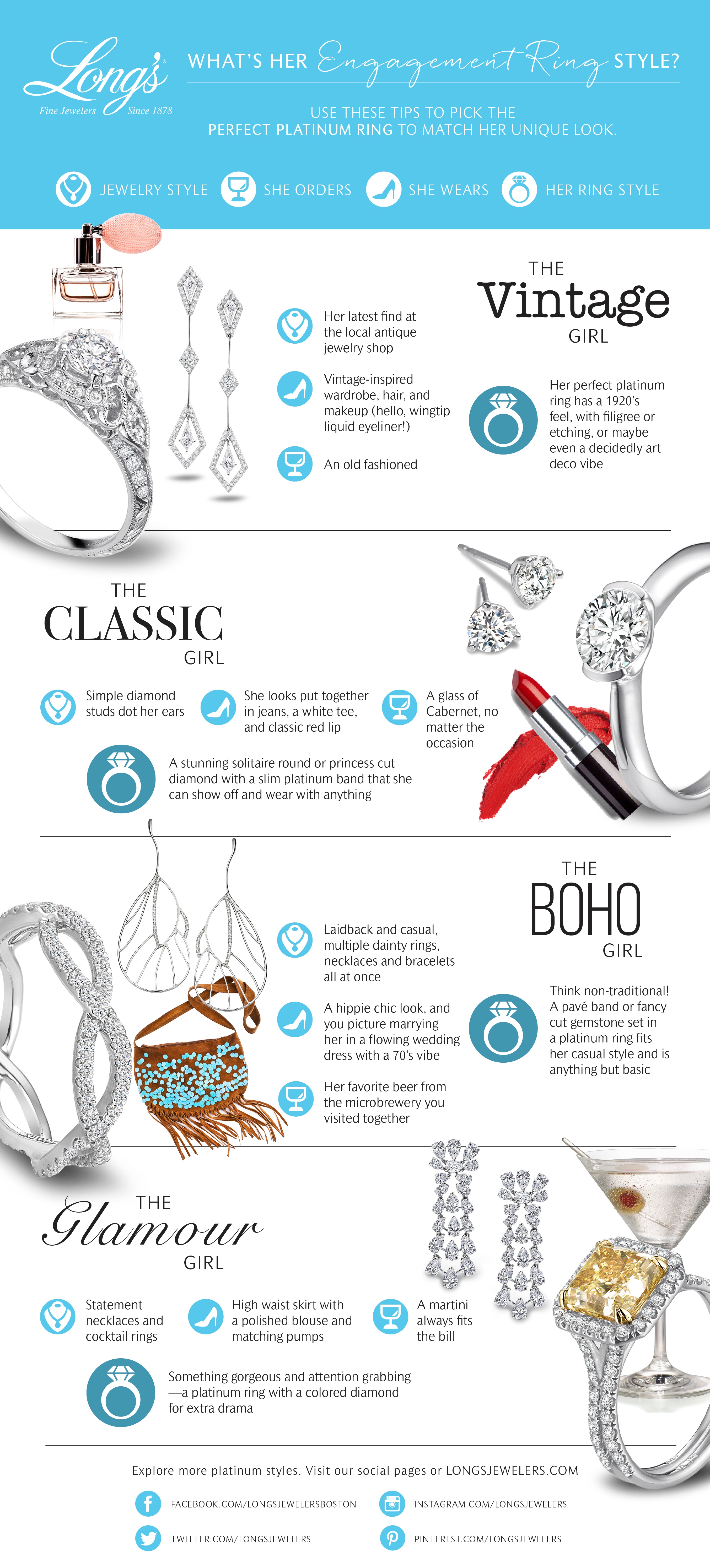What's Her Engagement Ring Style? [Infographic] Author Long's Jewelers Share Facebook Share on Facebook Email Email Date Feb 15, 2021 Engagement What's Her Engagement Ring Style? [Infographic] Think about your girlfriend for a second. Is she a classic girl? Or does she have more of a vintage or glamorous style? When it comes time to pop the question, these character and personality traits can help you choose the perfect ring for her. In this infographic, we share some of our top engagement ring picks for all types of women. All of the rings featured are platinum, meaning they are made of one of the most durable metals that you could choose! Platinum is a pure metal that is sure to last a lifetime. So before you start thinking about the perfect ring, make sure you really understand what her personal style is and how that can help lead you in the right direction: Looking for the perfect engagement ring? Feeling inspired? Visit any of our five retail locations in New England or make an appointment to meet with one of our engagement ring specialists. We'll walk you through the process so it can be a stress-free experience. Subscribe Email Engagement Estate Jewelry Wedding Watches Fine / Fashion Jewelry JOIN