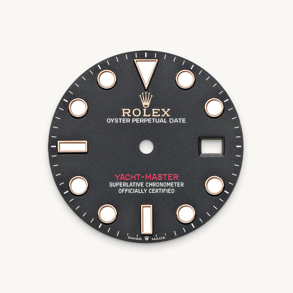 The Yacht-Master’s bidirectional rotatable 60-minute graduated bezel is made entirely from precious metals or fitted with a Cerachrom insert in high-tech ceramic. The raised polished numerals and graduations stand out clearly against a matt, sand-blasted background. This functional bezel – which allows the wearer to calculate, for example, the sailing time between two buoys – is also a key component in the model’s distinctive visual identity.